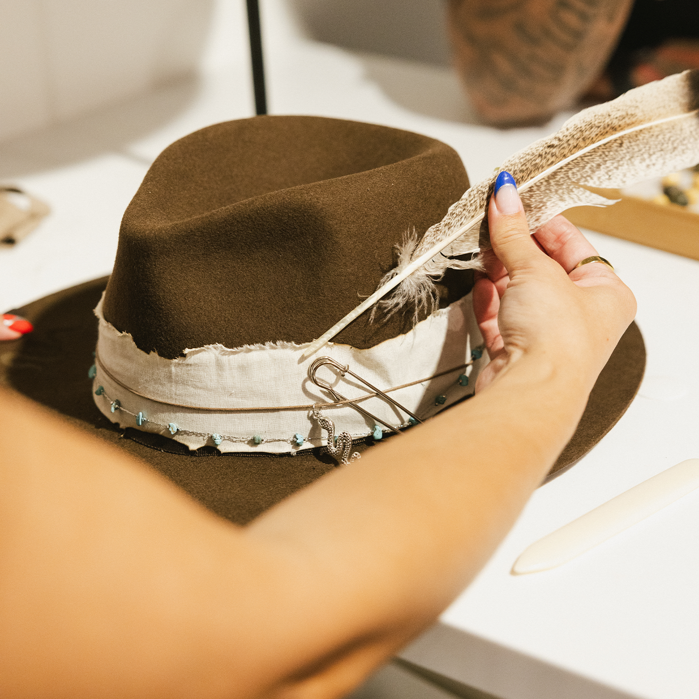 Our Virtual Hat Bar brings the full experience to you. Join our expert Hat Tenders over Zoom or Google Meet for a one-on-one or group session that’s every bit as personal and creative as being in-store. From selecting your perfect base brim to shaping, trimming, and customizing every detail, you’ll craft a hat that’s uniquely yours no matter where you are. The total experience is only $250 and includes your hat, custom banding options, embellishments + branding. Premium options will be available to purchase if desired. Gather your crew, get comfy, and get ready to design your next signature look, all on your own terms.